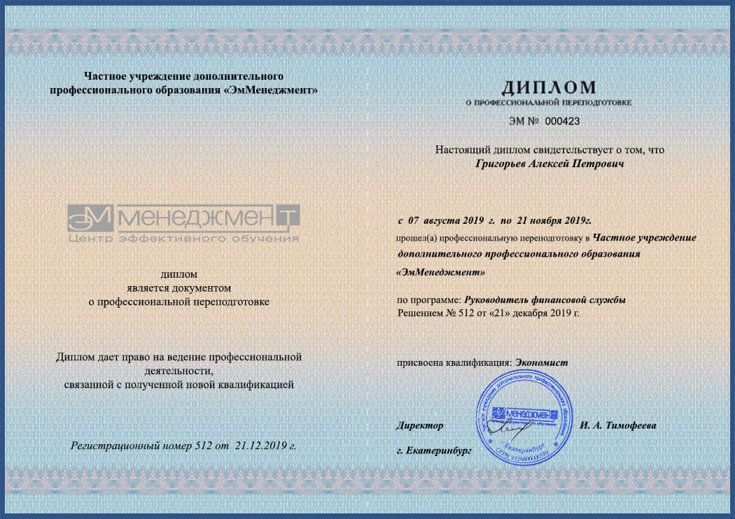 Курс позволяет получить новую специальность в сфере экономики предприятия на базе высшего или среднего профессионального образования. После прохождения обучения по программе Руководитель финансовой службы слушателям выдается диплом о профессиональной переподготовке и присваивается дополнительная квалификация Экономист по Профстандарту. Полученные знания и специальность способствуют практически неограниченному карьерному росту, а диплом подтверждает их полноту и качество.